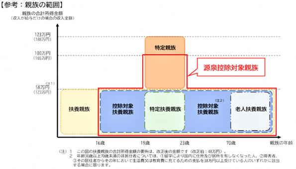 納税義務者に、19歳以上23歳未満である 特定扶養控除 対象者がいる場合、その納税義務者の前年の総所得金額から、所得税は63万円、住民税は45万円控除することとされていましたが、合計所得金額が58万円を超える19歳から23歳未満の親族がいる場合においても、納税義務者が受けられる控除額が当該親族の合計所得金額に応じて徐々に減少していく仕組みで新たに設けられます。