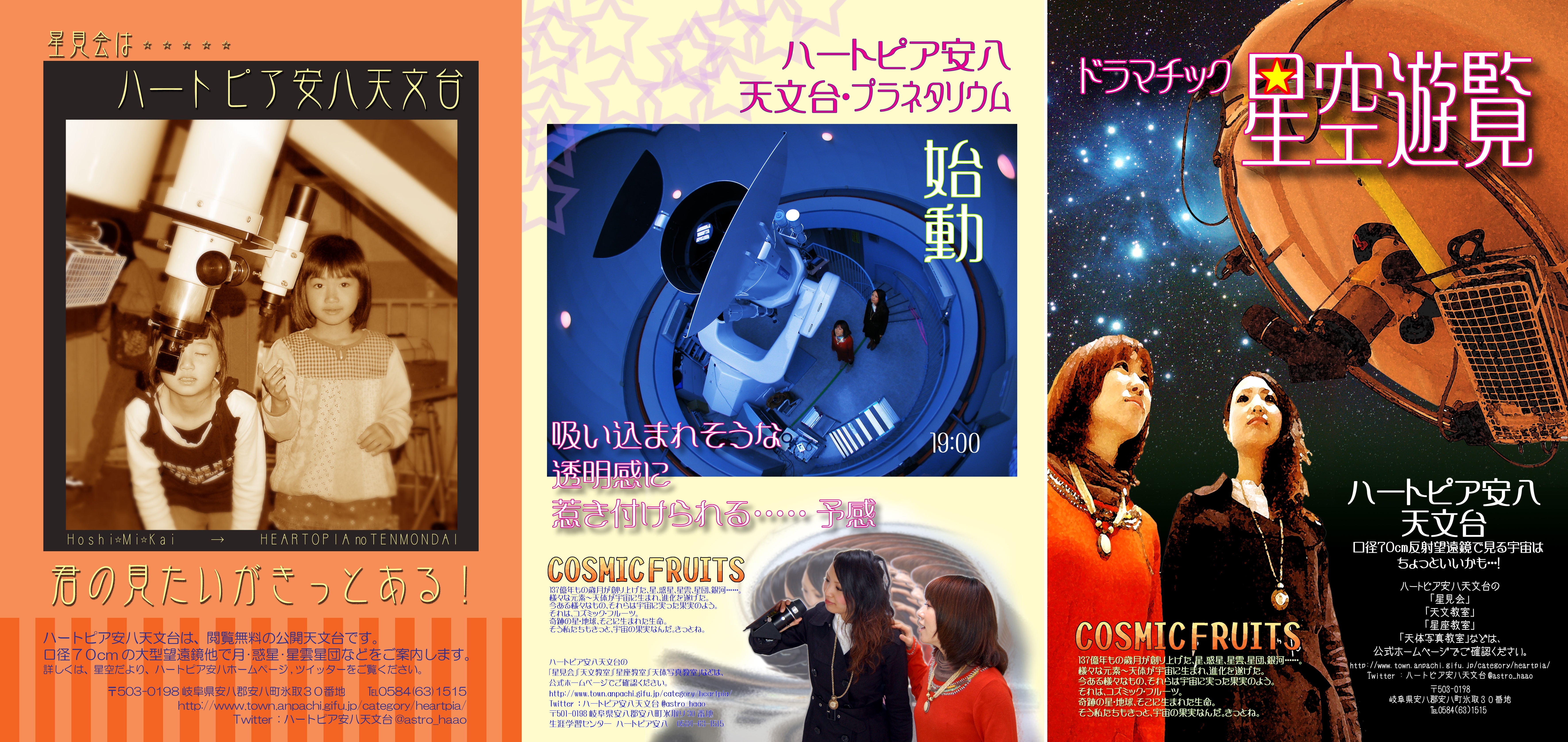 ハートピア安八の3階のドームの中には、口径70cmの反射望遠鏡があります。同架されているのは、口径15cm屈折望遠鏡と口径10cmの太陽望遠鏡(3本)です。