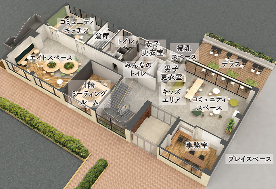 多目的に利用できる、プレイスペース。バリアフリーの多目的トイレ、更衣室、授乳室も設置し防災施設としても役立てます。