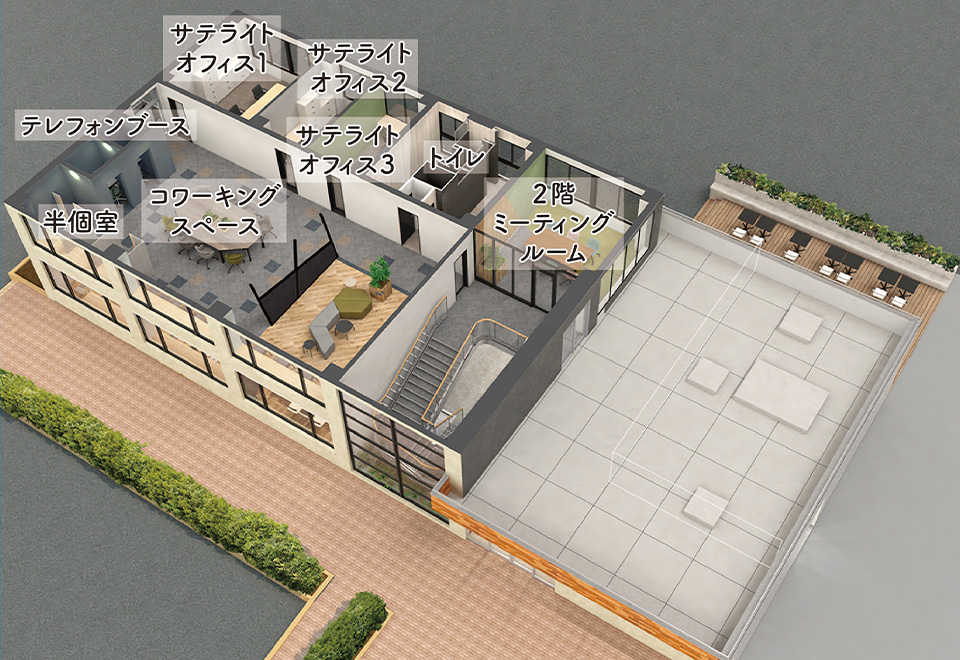 2階は都心に企業を構える方々から地域のワーカーまで、居心地良く、集中できる快適なワークスペースを提供します。
